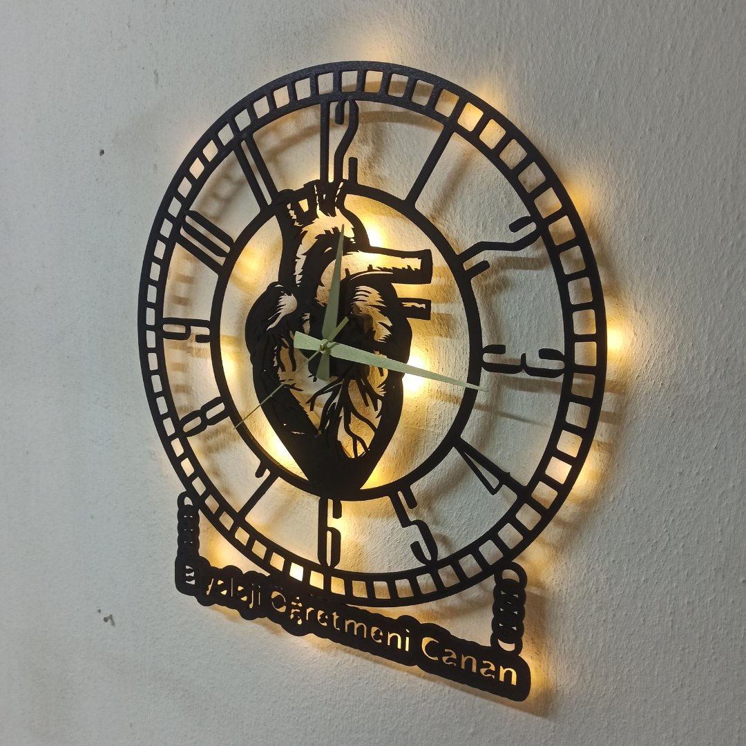 Biyoloji öğretmeni duvar saati, hediye duvar saati öğretmene, kalp figürlü duvar saati, kalp tasarım duvar saati, kişiselleştirilmiş duvar saati, kişiye özel öğretmen saati, LED ışıklı dekoratif saat, Modern duvar saati, öğretmenler için dekoratif saat, özel tasarım saat biyoloji, şık ve modern aydınlatmalı saat, tıp temalı duvar saati