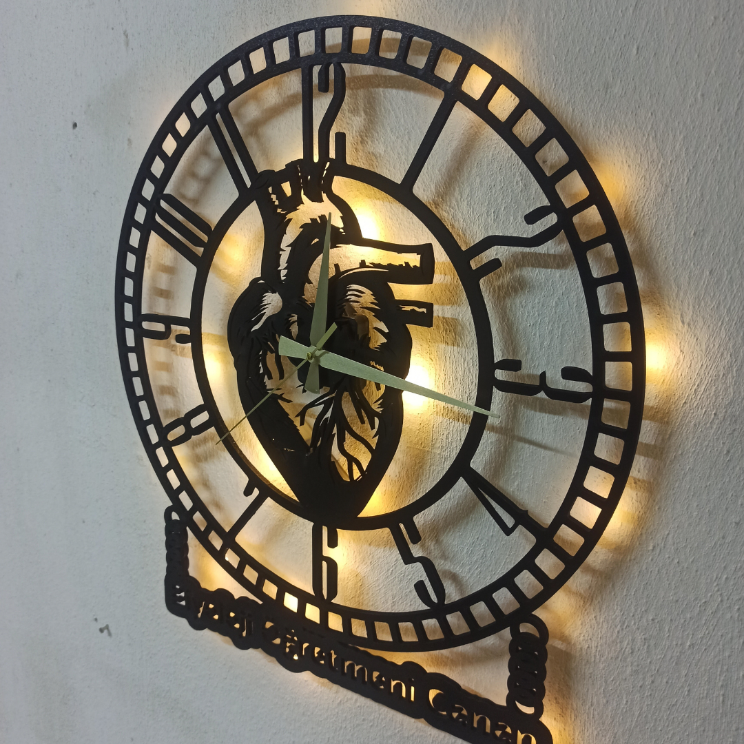 Bu Kişiye Özel Kalp Tasarım Saat, 50 cm çapında, lazer kesim detaylarıyla hazırlanmış olup, sade ve modern dekorasyonlarla mükemmel bir uyum sağlar. Saat mekanizması sessiz çalışarak rahatsızlık vermez. Işıklı yapısı sayesinde gece bile kolayca görülebilir.