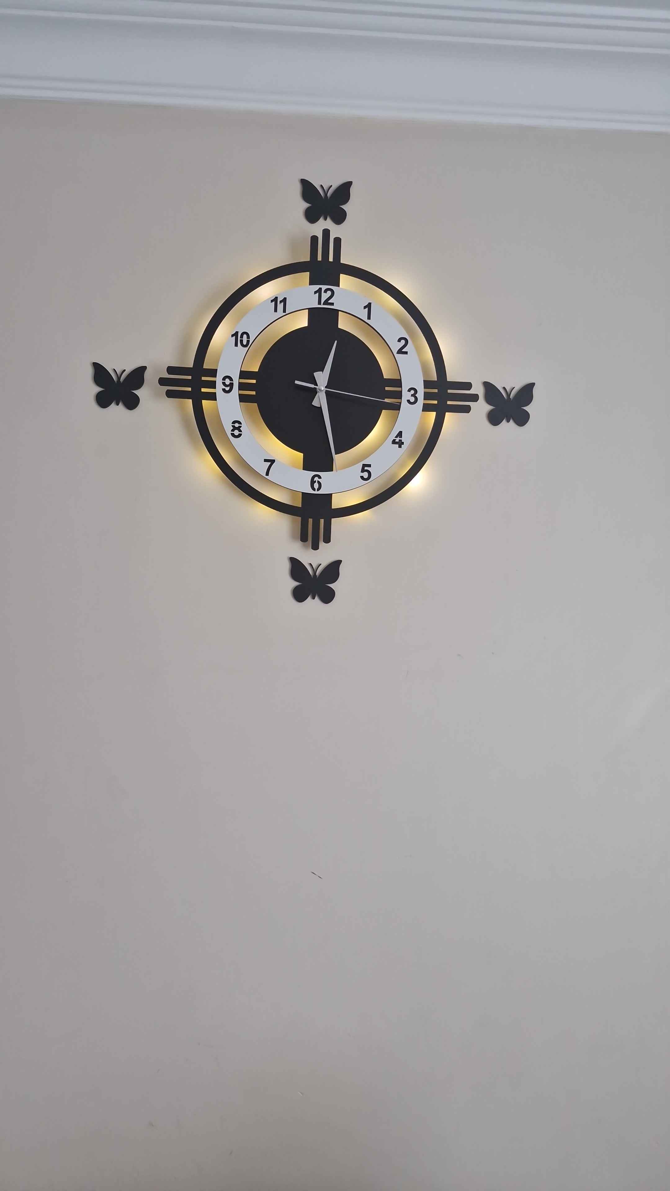 Beyaz desenli duvar saati, dekoratif duvar saati, ev dekorasyonu için duvar saati, ışıklı modern duvar saati, LED ışıklı saat, mdf duvar saati, minimalist duvar saati, modern dekoratif saat, pilli duvar saati, şık tasarım duvar saati